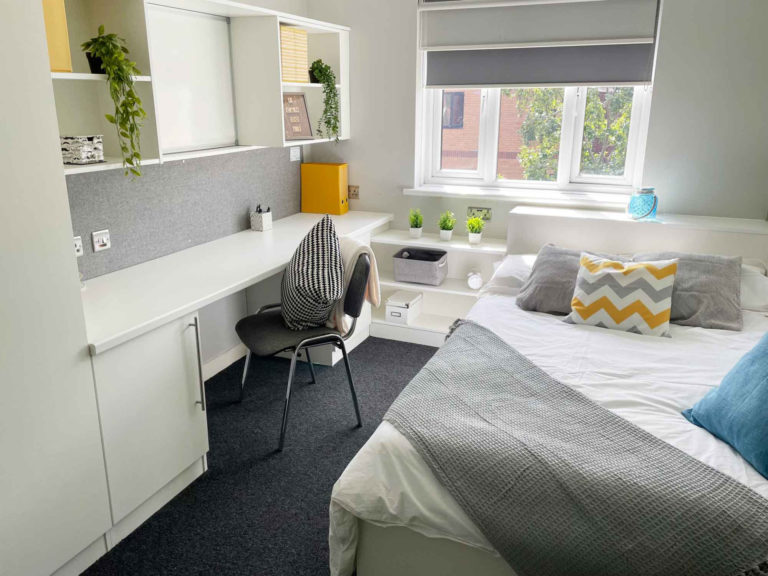 Our range of stylish apartments offer a home-from-home experience and are the perfect setting for students to relax and unwind after a busy day studying. Featuring a double bed, study area, wardrobe, fitted kitchen together with an ensuite bathroom our 1 bedroom apartments are designed to offer that extra space and comfort.