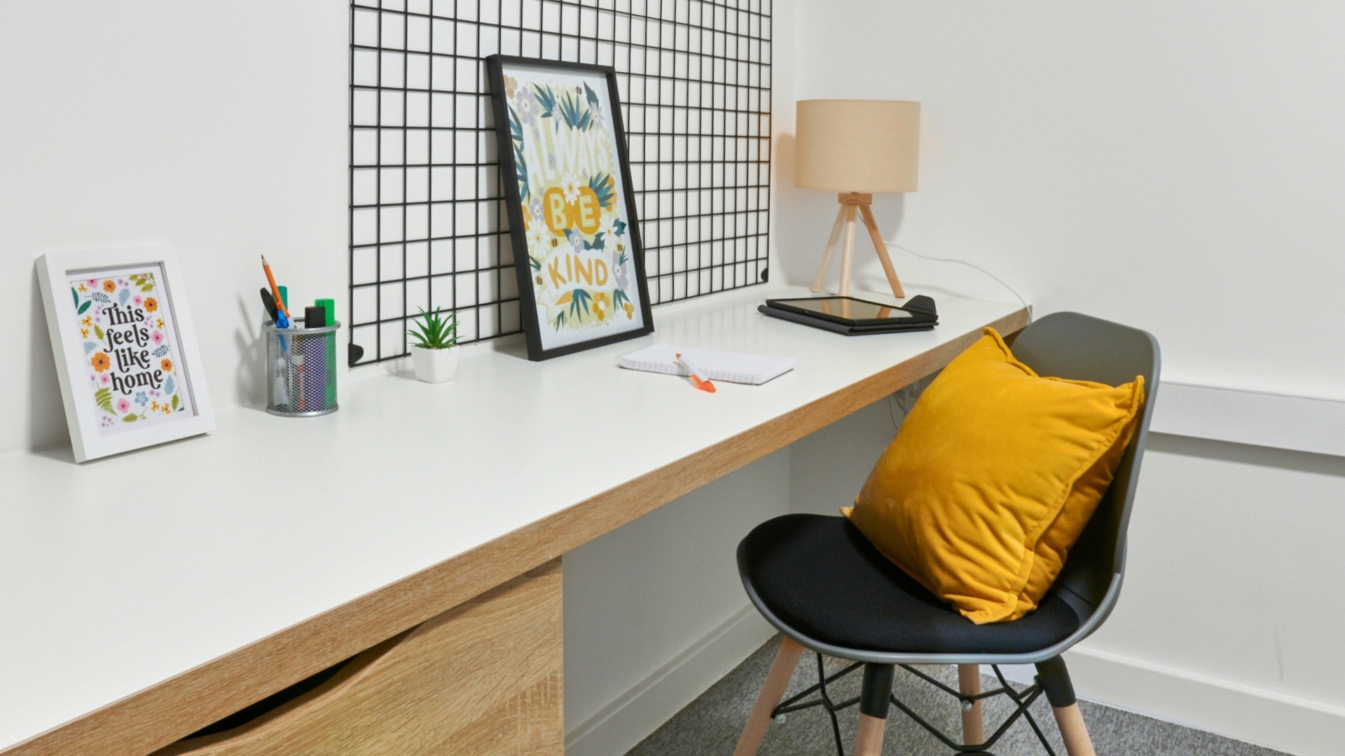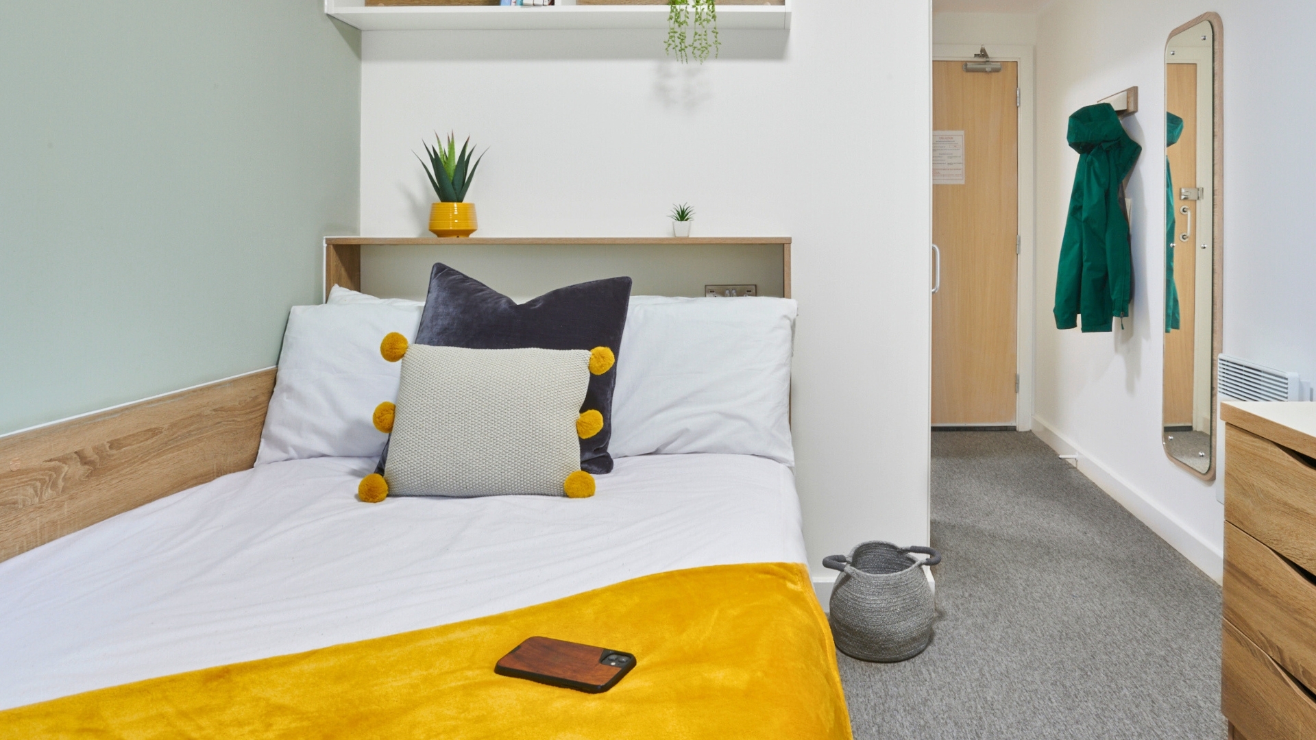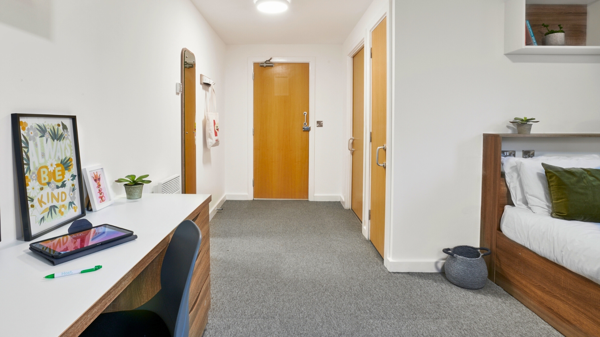 Fully furnished en-suite bedroom with private bathroom, 3/4 double bed, plenty of storage space including a wardrobe, bedside shelf, drawers, coat hooks and underbed storage. Large desk and chair, bookshelves and noticeboard for studying. Free Wi-Fi & Internet plus contents insurance and all your bills included as standard.