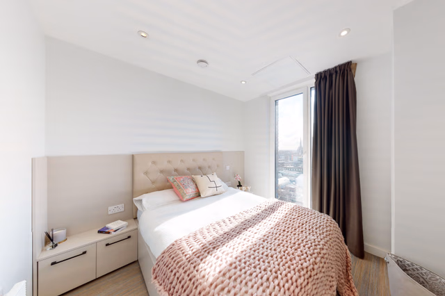 Ensuite student accommodation includes a private bedroom and bathroom. The bedroom is spacious and includes a comfortable bed, a study area, and a huge storage area. Students get a shared kitchen with well-equipped amenities including a hob, and freezer. Students can enjoy the privacy of their bedroom while sharing the kitchen and living room.