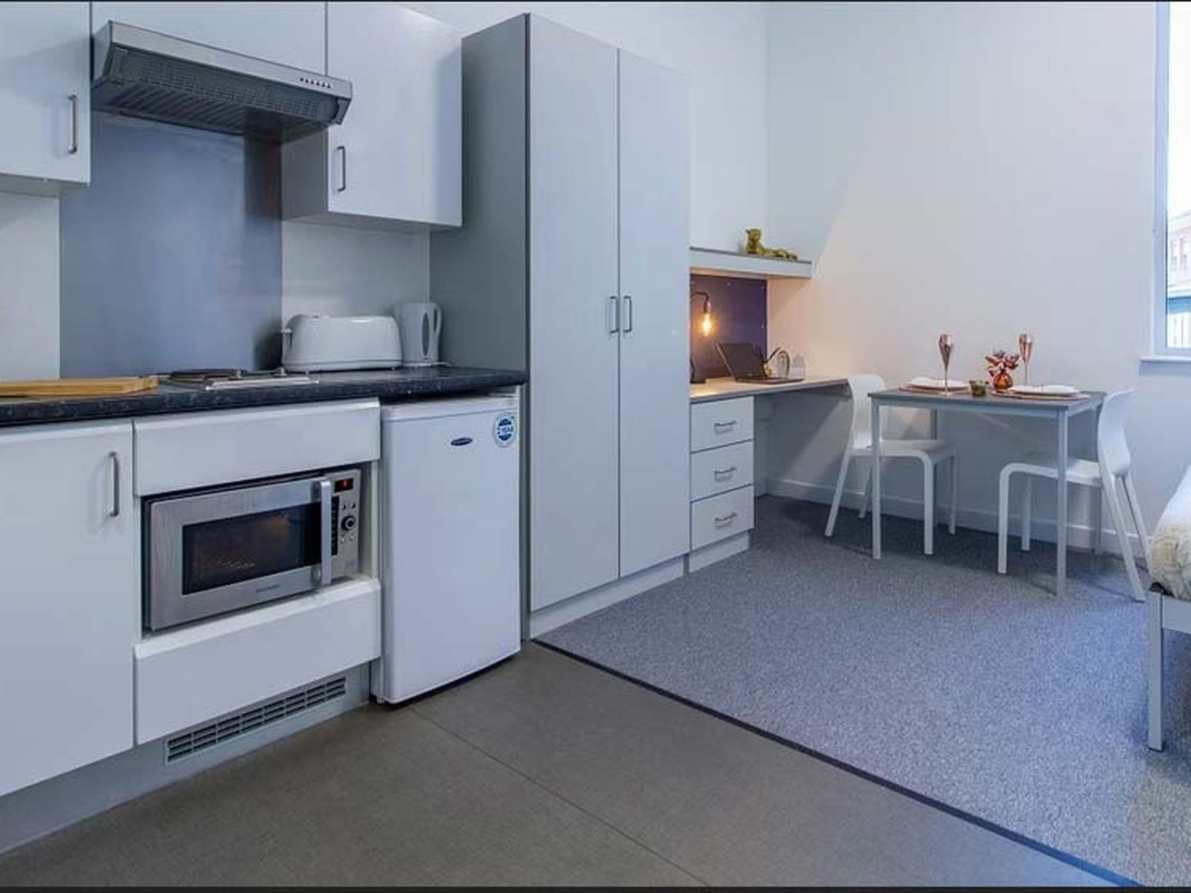 Ensuite student accommodation includes a private bedroom and bathroom. The bedroom is spacious and includes a comfortable bed, a study area, and a huge storage area. Students get a shared kitchen with well-equipped amenities including a hob, and freezer. Students can enjoy the privacy of their bedroom while sharing the kitchen and living room.