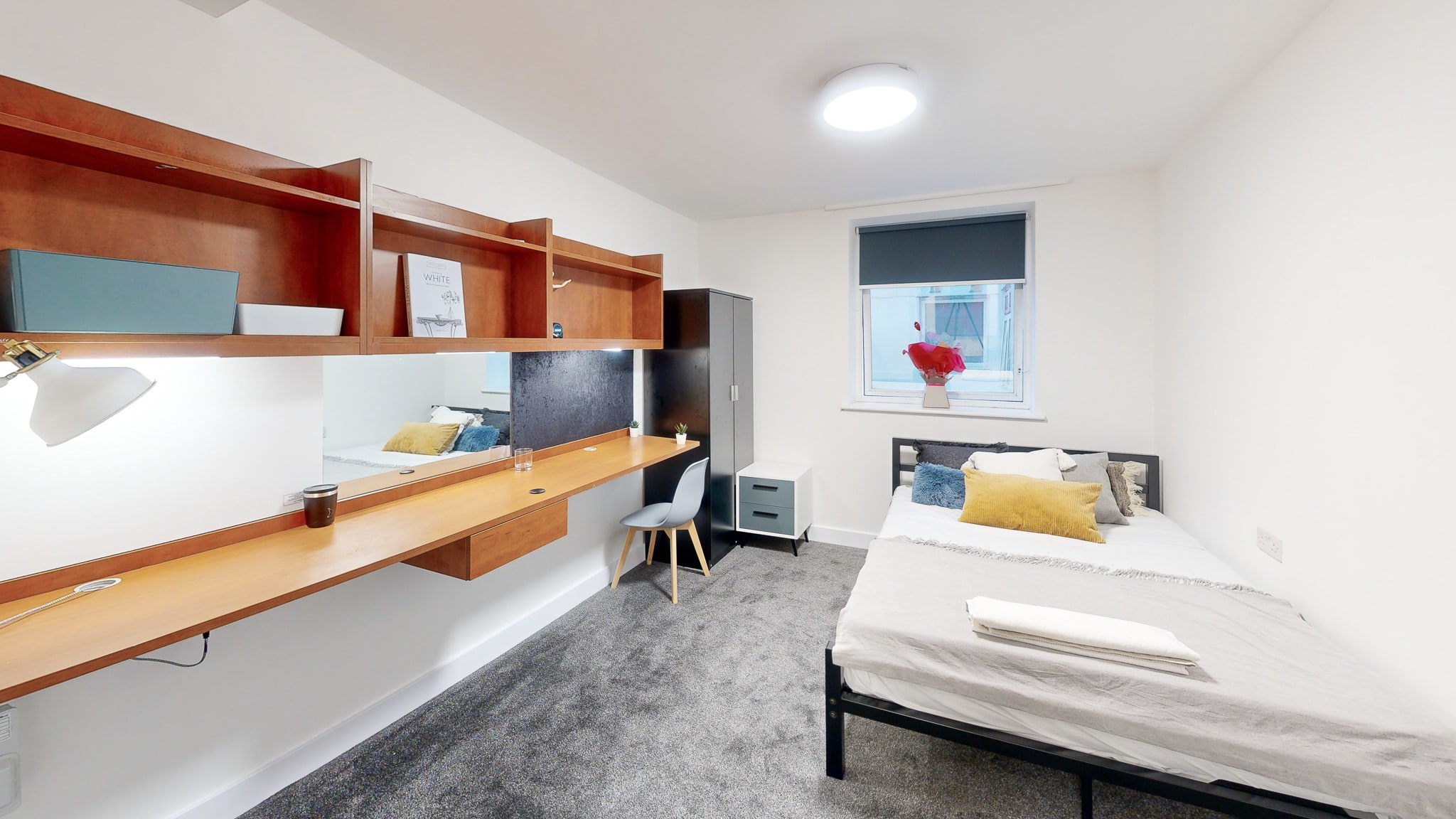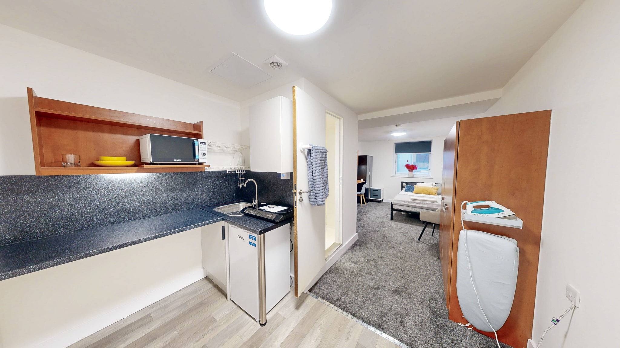 Ensuite student accommodation includes a private bedroom and bathroom. The bedroom is spacious and includes a comfortable bed, a study area, and a huge storage area. Students get a shared kitchen with well-equipped amenities including a hob, and freezer. Students can enjoy the privacy of their bedroom while sharing the kitchen and living room.
