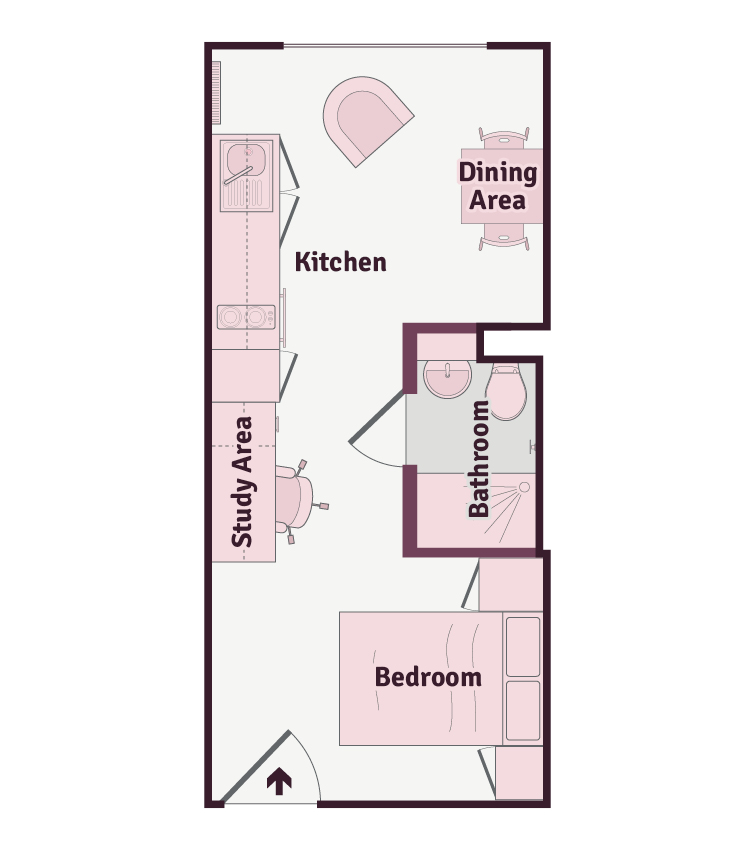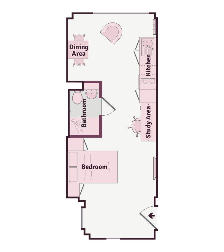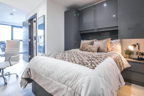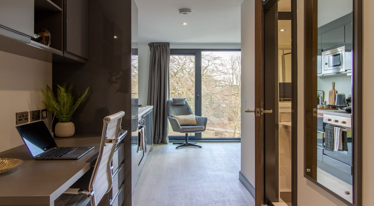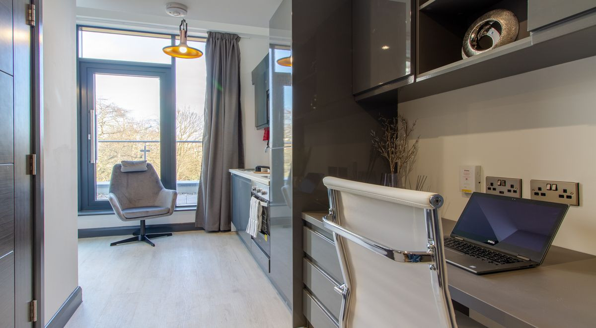 A luxury studio measuring around 20-22m² comes with a three quarter sized bed, dining area, ample storage, study desk and chair and modern kitchenette with fridge-freezer, microwave oven and hob. This studio also has a fully fitted en-suite containing a shower and stylish fittings. You will also have access to the cinema and games room, and a communal dining room.