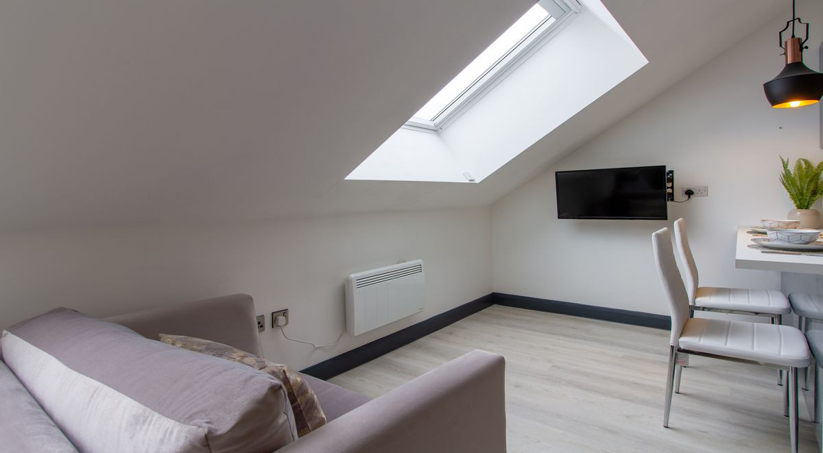 Our Executive Studio Plus room measures 24m2 and features velux windows offering great views across the city. This spacious room style comes fully-furnished with all the amenities you could need, including a comfy 3/4 bed for relaxing after a day at uni, a dining area and kitchen for inviting friends over, a study desk and chair for study sessions as well as your own stylish en-suite.