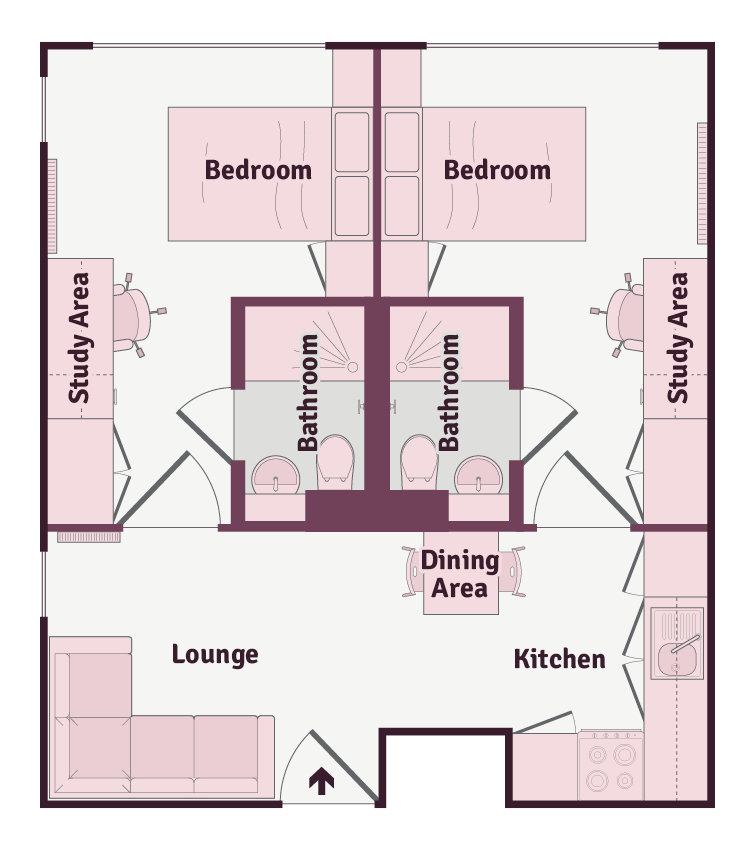 This spacious 2 bed apartment comes complete with a fully fitted modern kitchenette, a three quarter sized bed, generous storage, large study area, and a stylish en-suite bathroom per room. You will also have access to the cinema and games room, and a communal dining room.