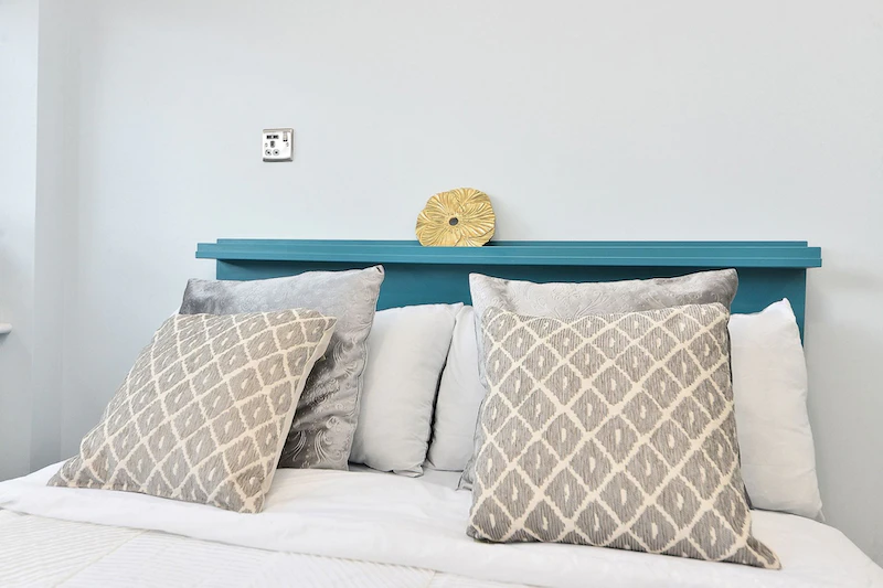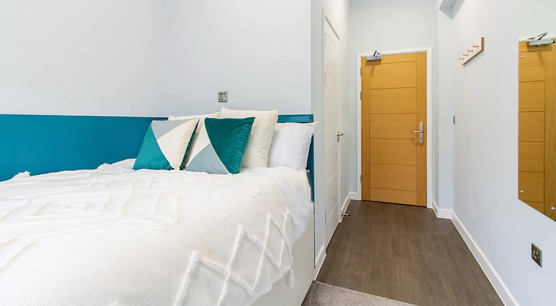 A self-contained Studio apartment with large bed, under-bed storage, wardrobe, bedside table, study desk, private fully fitted kitchenette and en-suite fitted with power shower.