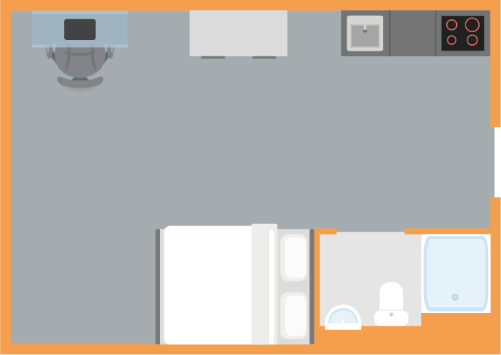 A 20-22m2 Premier self-contained Studio apartment with large bed, under-bed storage, wardrobe, bedside table, study desk, private fully fitted kitchenette and en-suite fitted with power shower.