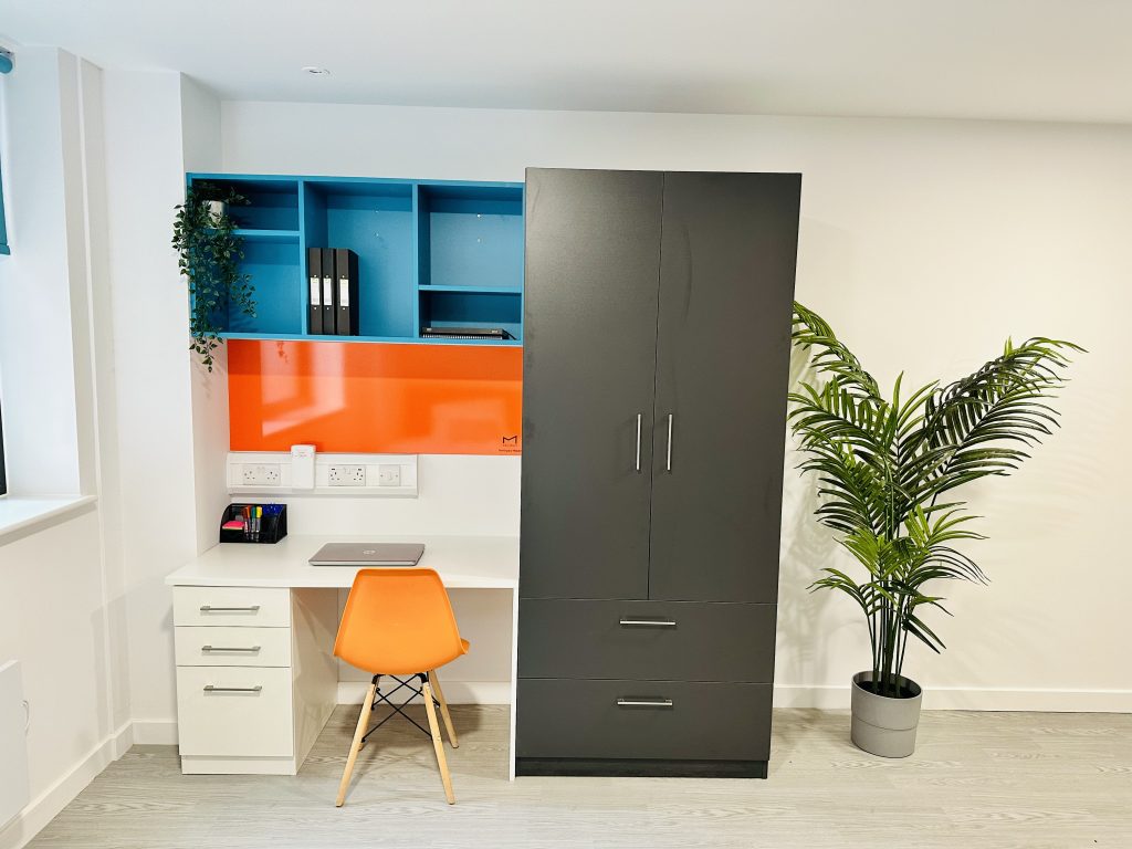 This modern, sleek (up to 20m2) studio is perfect if you are wanting to concentrate on your studies and have everything on hand in one place. It comes with a ¾ bed which incorporates a headboard with storage and charging points so you can charge your phone whilst in bed. Each room comes with a wardrobe, shelving, desk with drawers and has a large window which lets in a lot of natural light. Your studio comes with a kitchen, sink, storage, wall cupboard, fridge with freezer compartment and a very cool breakfast bar where you can eat from or chill and have a coffee there in a morning. It also has an en-suite with a WC, shower, sink, toilet and accessories. Available on the 1st, 2nd 3rd and 4th floors.