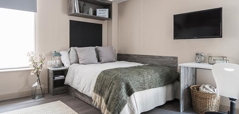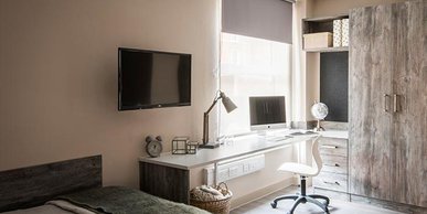 4ft Double Bed Desk Study Chair Double Wardrobe 32” Flat Screen TV (TV licence not included) En-suite Bathroom Breakfast Bar and Stools Fridge (with ice box) Combination Microwave 4 Ring Hob