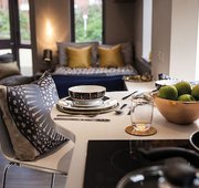 Largest Private Studio Apartment 27m2 Larger floor space than Premier Studio Plus 4ft Double Bed Desk Study Chair Double Wardrobe 32” Flat Screen TV (TV licence not included) En-suite Bathroom Breakfast Bar and Stools Fridge (with ice box) Combination Microwave 4 Ring Hob