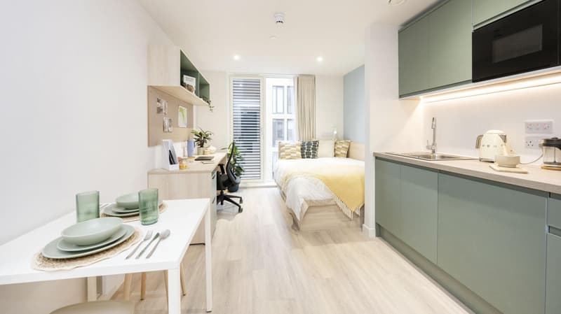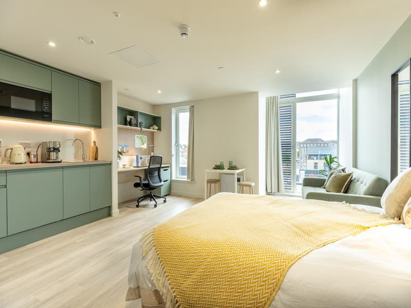 Embrace an elevated lifestyle with the Classic Studio Plus, spanning 19.8m² to 21.5m², designed for both comfort and style. This room features a cosy bed, a study area with a stylish desk and chair, and a spacious cupboard to keep everything tidy and accessible. The private bathroom adds a layer of luxury, and the private kitchen, equipped with combi microwave, fridge-freezer, and hob, gives you the freedom to cook as you please. Ideal for students who value space and sophistication.