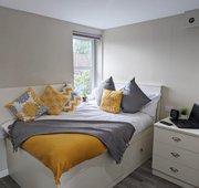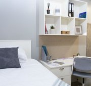 Newly refurbished this year, our stylish prestige studios offer you that added extra space in a bright modern living environment. Featuring a large ¾ bed with underbed storage, study desk and chair, a double wardrobe, bookshelves and drawers you have plenty of space for your belongings. With a fresh bright ensuite and a small, fitted kitchen the prestige studio gives you that extra space and privacy you require. The kitchenette includes a microwave oven, fridge with ice box, 2 induction hobs and a sink. Room size is 22.7 sqm