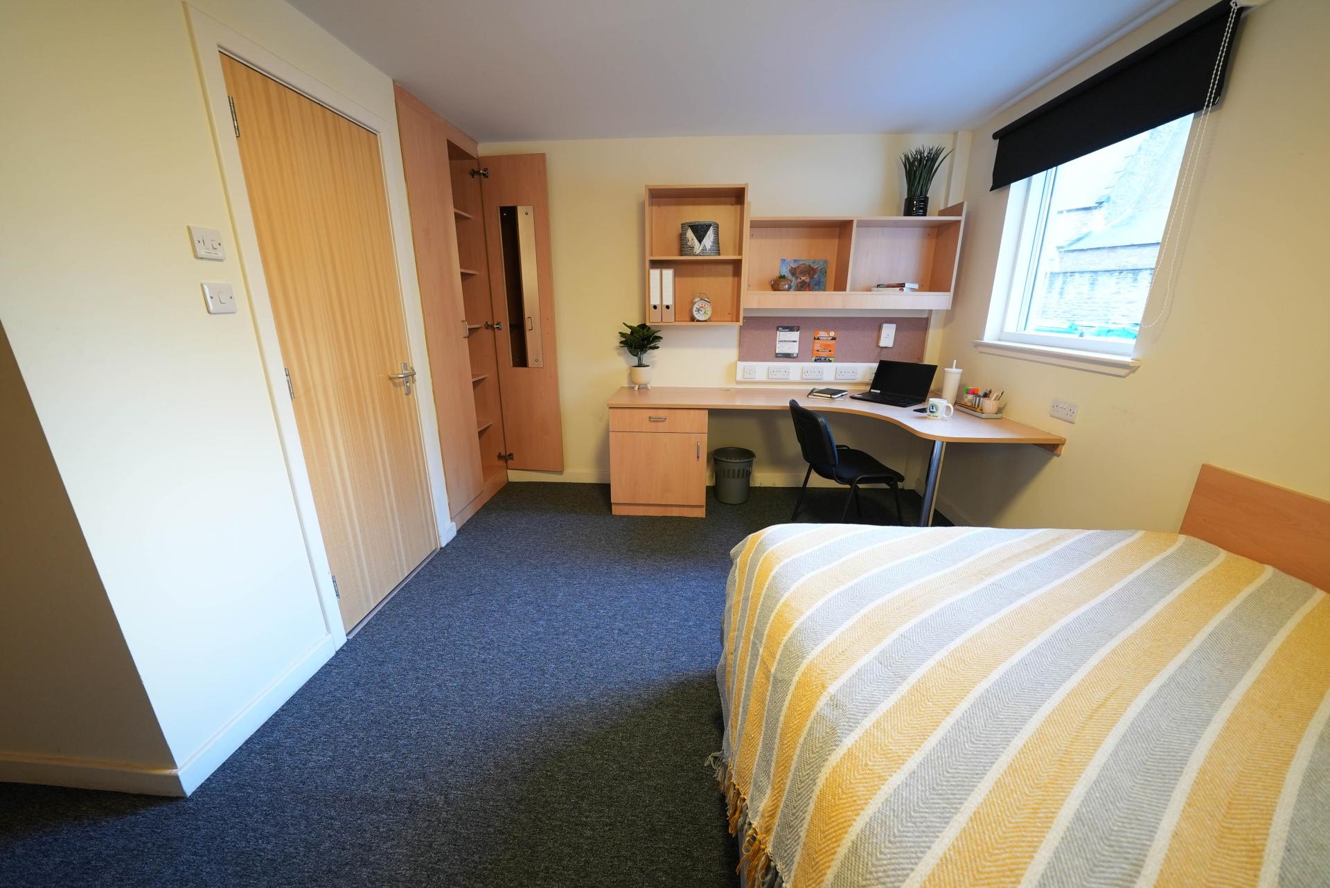 Double bed with under bed storage Study desk and desk chair Floor to ceiling double wardrobe En-suite shower Book shelves Drawers Private room access