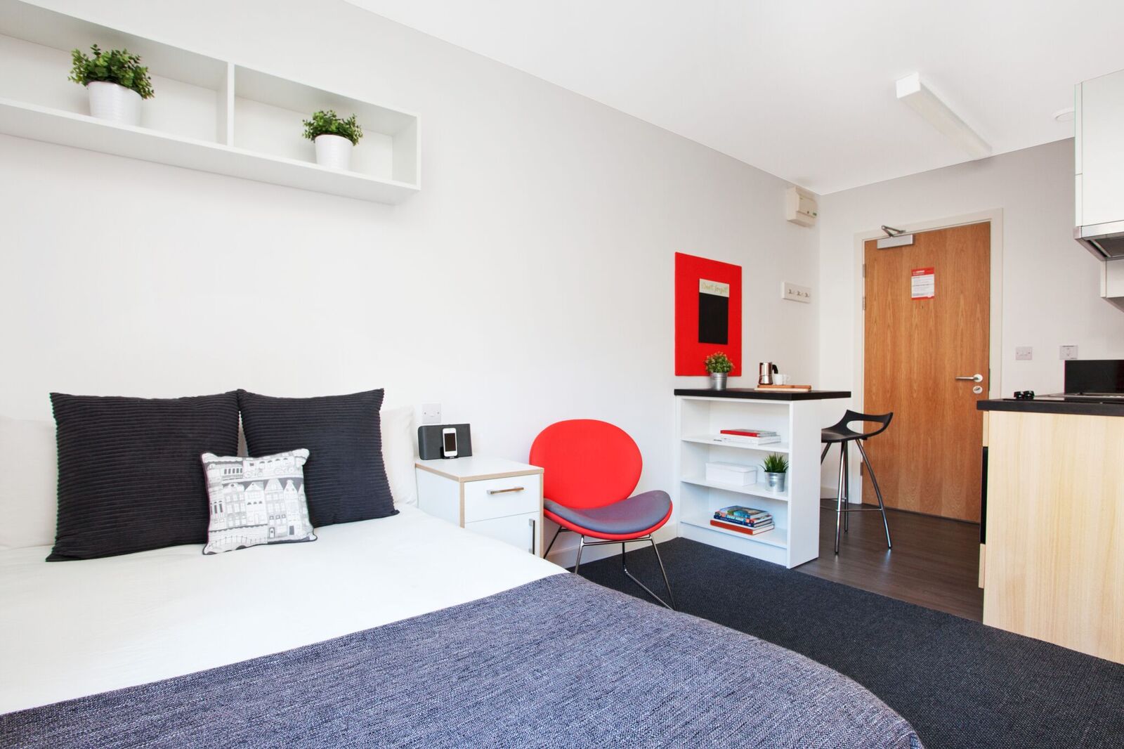 A 23.m² self-contained studio features a double bed with under-bed storage, wardrobe, study desk, en-suite bathroom, private dining space, and a fully-fitted kitchenette equipped with cooking hobs, combi-oven, and fridge/freezer.