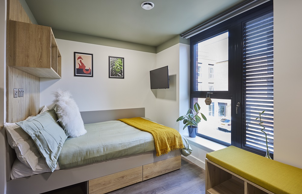 The deluxe en suite (top floor) benefits from views available on the top floor and measures 13.4m², coming complete with a queen bed, study desk and chair, wardrobe, and ample storage. All of our rooms are equipped with their own private en-suite containing a shower, sink, WC, and modern fittings. Six residents share a flat with deluxe en-suite rooms and a fitted kitchen that includes an oven, electric hob, fridge, freezer, and seating area.
