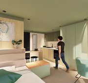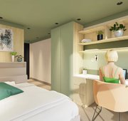 Our studio plus measures 14.8-16.4m², this self contained studio comes with a queen bed, study desk and chair, wardrobe, and ample storage. All of our studios are equipped with their own private en suite containing a shower, sink, WC. There is a modern fitted kitchen with a combination microwave oven, hob and undercounter fridge freezer. The studio plus is available on the ground floor only.