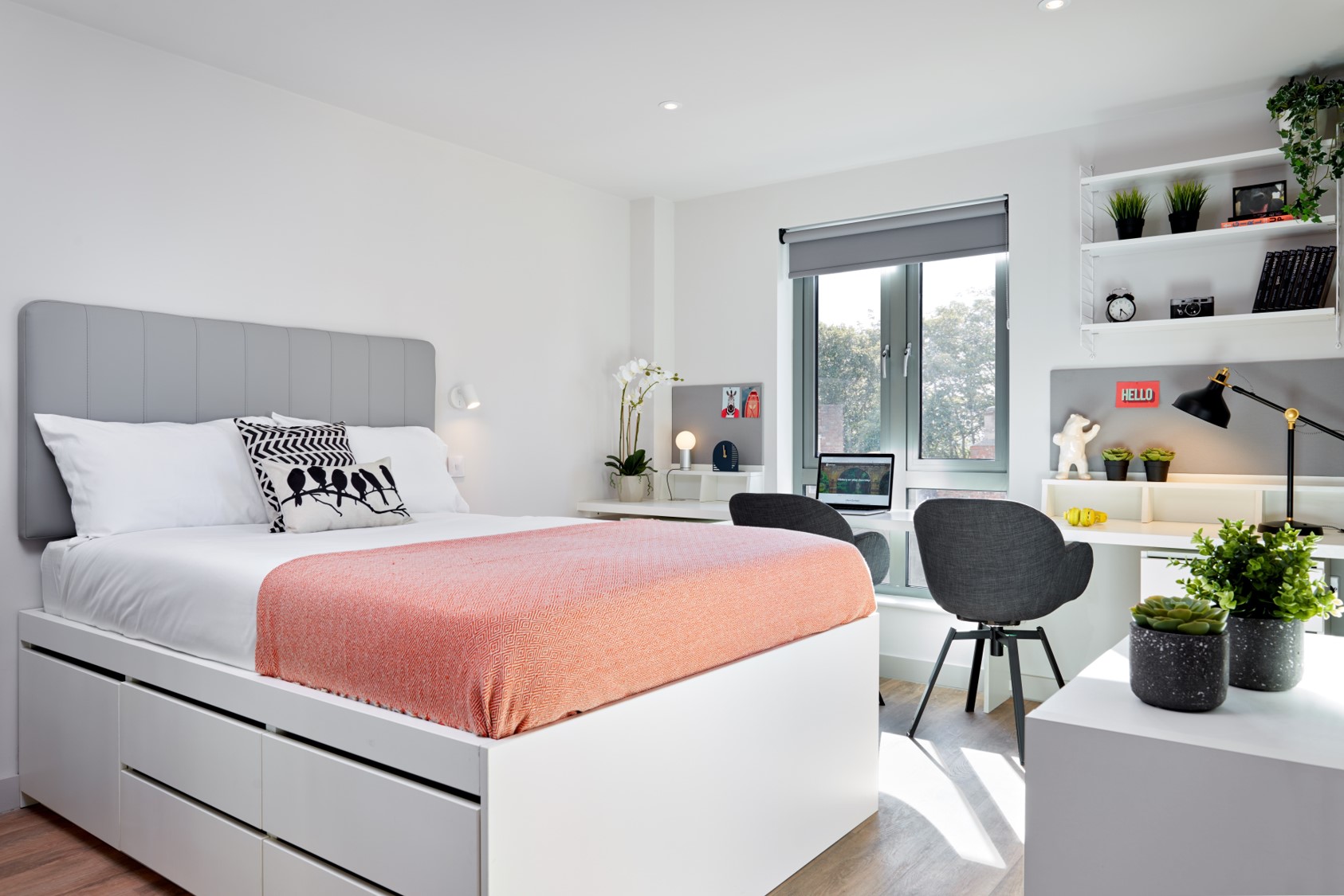 Studio room with en-suite bathroom. (Images are indicative - range of room layouts available). 18.9m2 average size.