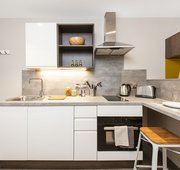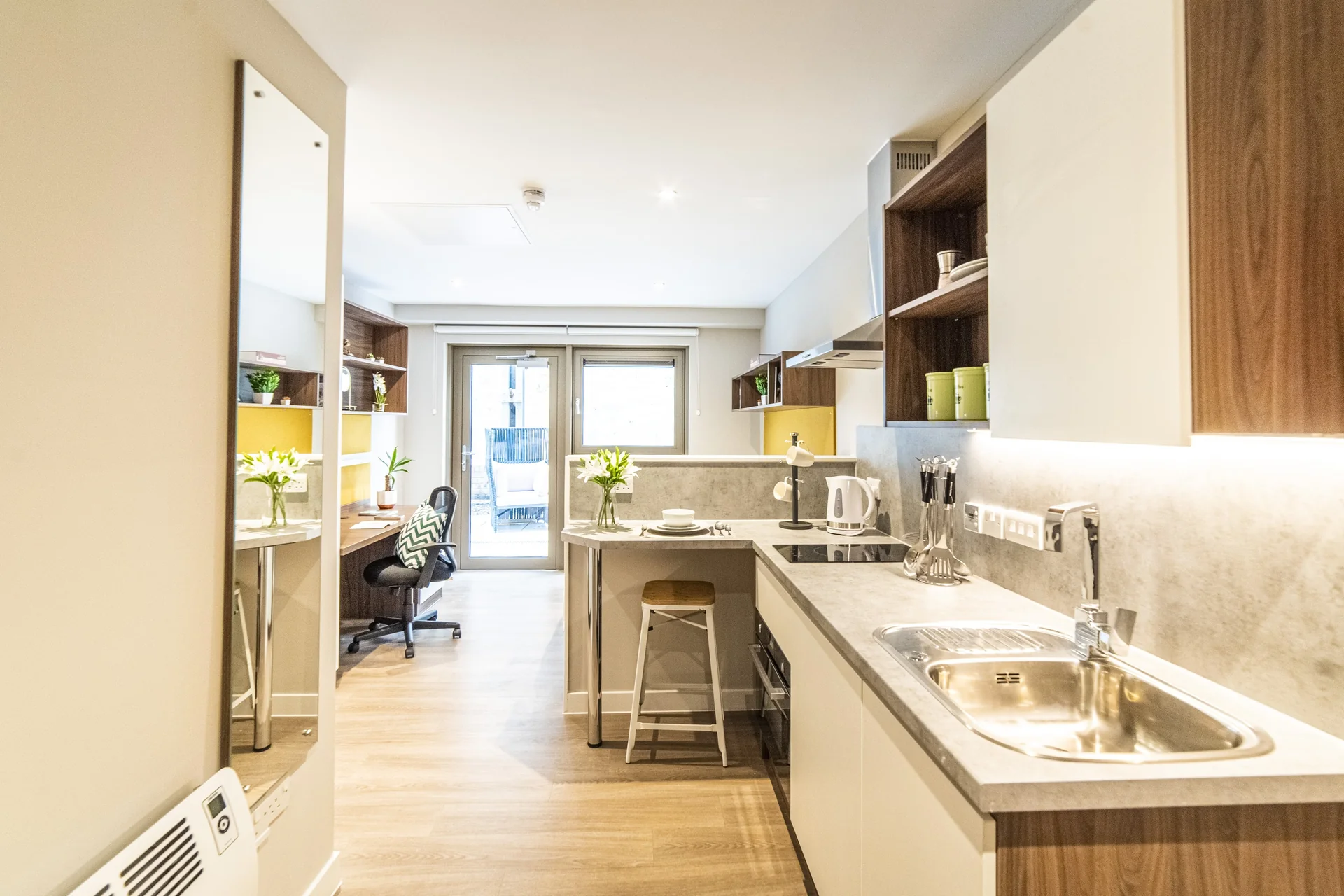 Self-contained kitchen, bathroom and living space Dual-occupancy available 17.4m – 24.09m² Approximately Small double bed Personal study space with desk, chair and wardrobes for additional storage.