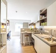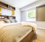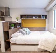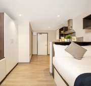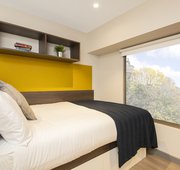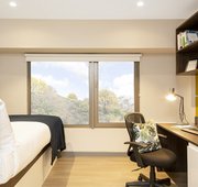 Self-contained kitchen, bathroom and living space Dual occupancy available Photography is for illustrative purposes, actual room may vary 16.2 m2 Approximately Small double bed Personal study space with desk, chair and wardrobes for additional storage included in the room.