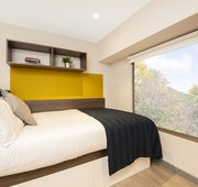 Self-contained kitchen, bathroom and living space Dual-occupancy available 15.7m² Approximately Small double bed Personal study space with desk, chair and wardrobes for additional storage.