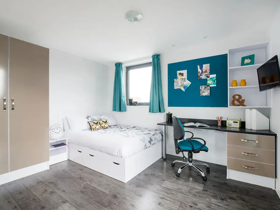 Our award-winning en-suite rooms benefit from loads of storage space, a small double bed and well-equipped lounge/kitchens. A good size, with modern bathrooms to match! Not to mention the common room and study zone you will also have access to.