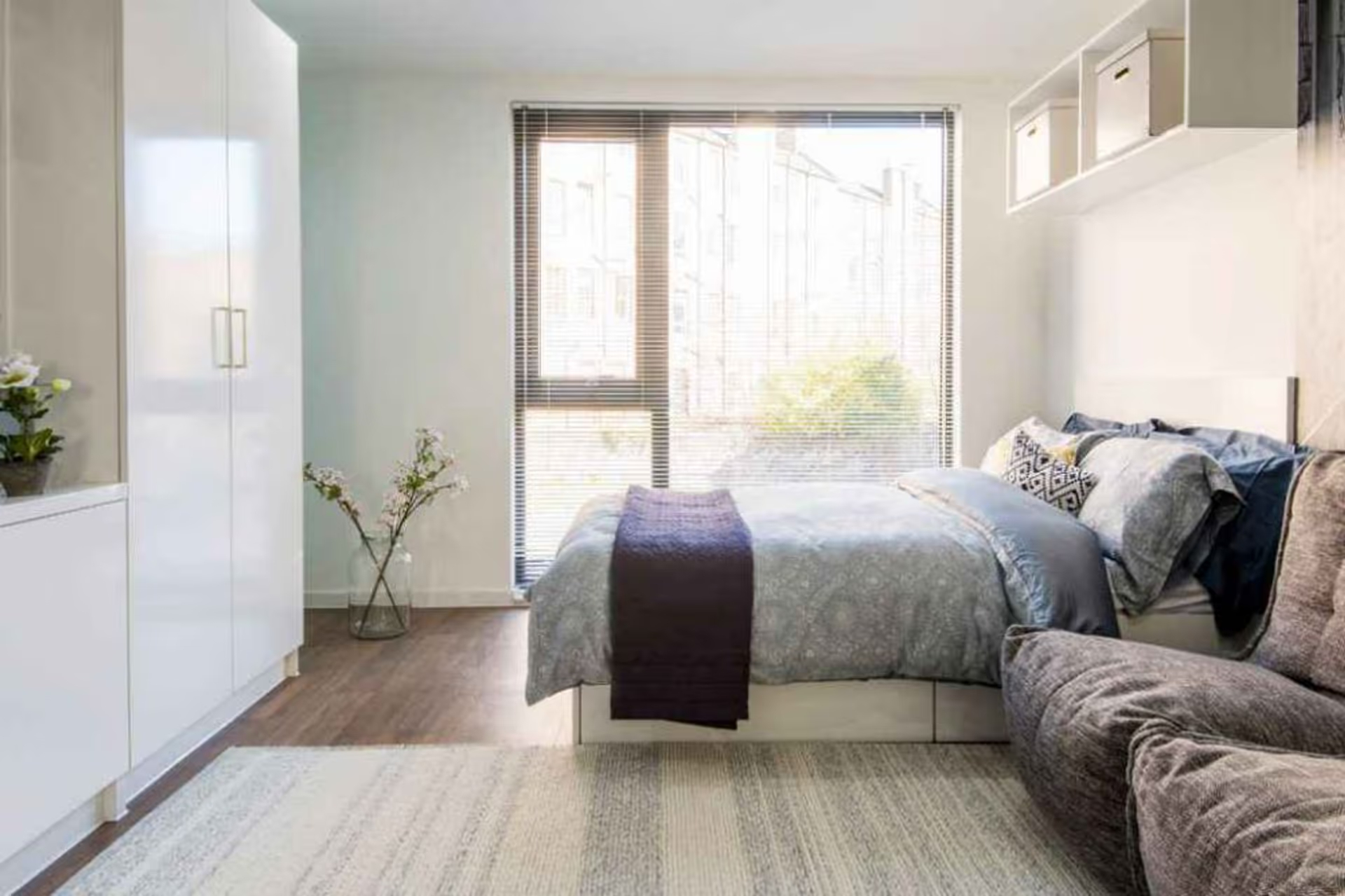 20sq.m Large bed (190x120cm) with under bed storage Bed side table Large desk space Height adjustable study chair Double wardrobe En-suite bathroom with shower High-gloss kitchen Microwave/Combi oven 4 ring hob Extractor hood Fridge/freezer Breakfast bar with stools Cupboard space Bean bag seat 32" Flat screen TV (Licence not included)