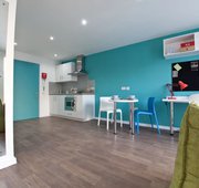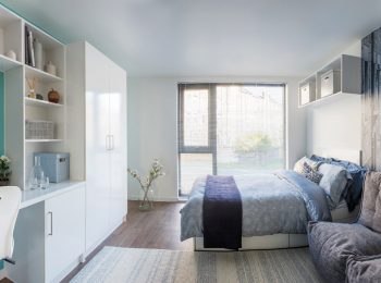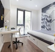 12.5-13sq.m Large bed (190x120cm) with under bed storage Bed side table Large desk space Height adjustable study chair Double wardrobe En-suite bathroom with shower Shared Kitchen/living area (between 2); High-gloss kitchen, microwave/combi oven, 4 ring hob, extractor hood, fridge freezer, breakfast bar with stool, cupboard space, bean bag seats, 32” flat screen TV (Licence not included)