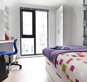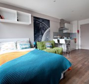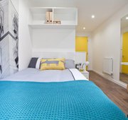 20sq.m Large bed (190x120cm) with under bed storage Bed side table Large desk space Height adjustable study chair Double wardrobe En-suite bathroom with shower High-gloss kitchen Microwave/Combi Oven 4 ring hob Extractor hood Fridge/freezer Breakfast bar with stools Cupboard space Bean bag seat 32" Flat screen TV (Licence not included)