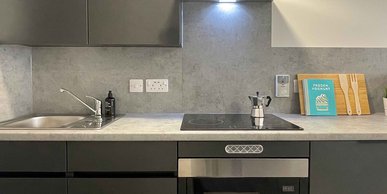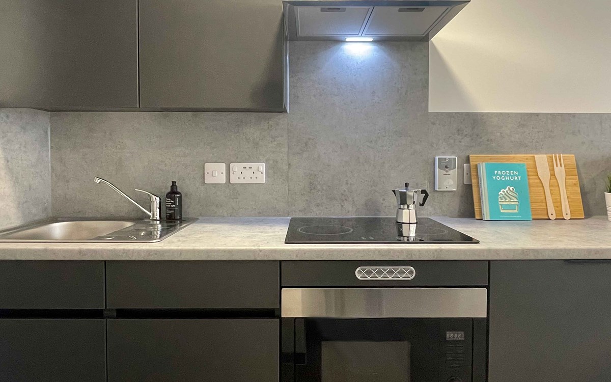 21.9m2 average size. Our studios are all contemporary in design and include the latest technology. They each come with their own accessible en-suite bathroom, private kitchen area and plenty of space for you to study or relax.