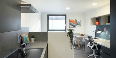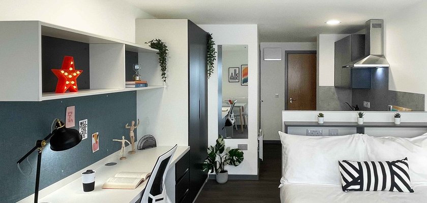 26.8m2 average size. Our studios are all contemporary in design and include the latest technology. They each come with their own accessible en-suite bathroom, private kitchen area and plenty of space for you to study or relax.