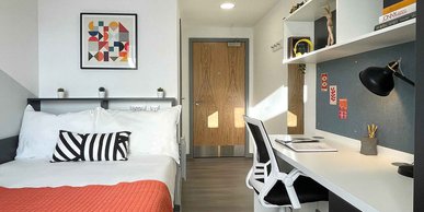 En-suite flat with access to shared kitchen and living space. (Range of room layouts available) 16.4m2 average size. Most rooms include a 3/4 bed.