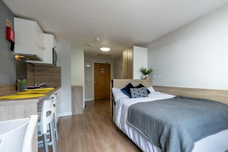 If you’re looking for a little extra space, the Superior Studio offers 25.9 to 27sqm of stylish and practical living. The room features a small double bed with under-bed storage, a spacious study area with a desk, chair, and shelves, and a wardrobe with a mirror to keep your space tidy. The private en-suite bathroom comes with a shower for added convenience. The kitchen area, complete with a 2-ring ceramic hob, combination microwave/oven, and combined fridge/freezer, ensures you have all the essentials. With wireless internet access and all-inclusive bills,