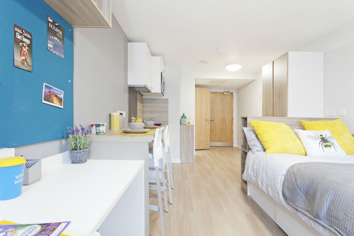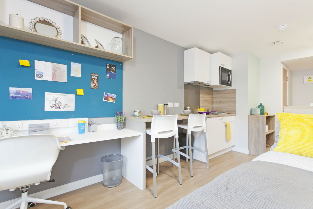 Wireless internet access - 2 ring ceramic hob - A combination microwave/oven - Combined fridge/freezer - Under bed storage - En-suite with shower - Wardrobe with mirror - Study area with desk, chair and shelves - Pin notice board - All bills included
