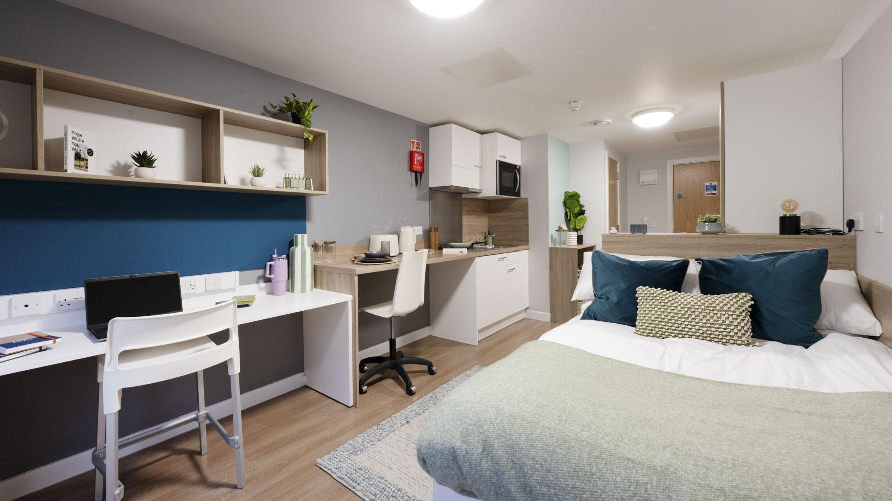 Designed for maximum comfort and accessibility, the Accessible Studio features a standard double bed with under-bed storage, a study area with a desk, chair, and shelves, and a wardrobe with a mirror for added convenience. The private en-suite bathroom is designed for ease of access, with a shower. The kitchen area, fitted with a 2-ring ceramic hob, combination microwave/oven, and combined fridge/freezer, ensures you have everything you need.