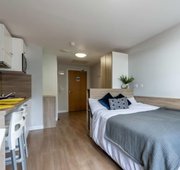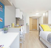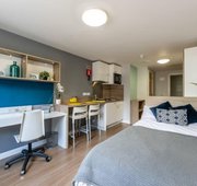 This studio is located on the ground floor, 1st, 2nd and 3rd floors. What's in the room? - Wireless internet access - 2 ring ceramic hob - A combination microwave/oven - Combined fridge/freezer - Under bed storage - En-suite with shower - Wardrobe with mirror - Study area with desk, chair and shelves - Pin notice board - All bills included