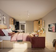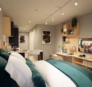 24.2m² | Double bed, desk chair, wardrobe, bedside table and underbed storage En-suite with a Smart TV, desk area, fully fitted kitchen with an integrated washer-dryer, dishwasher and breakfast bar area