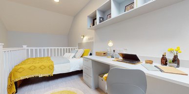 ELLI300-031125For those wanting the most spacious, private, independent student lifestyle, our Diamond Duplex Apartment option is an unbeatable option with 28 sq m of space. With a separate bedroom and living space, fully fitted kitchen with all the essentials plus loads of storage and your own bathroom, these flats are the ultimate in spacious, stylish student living. They also feature a study desk and chair and plenty of room and furniture for relaxing.