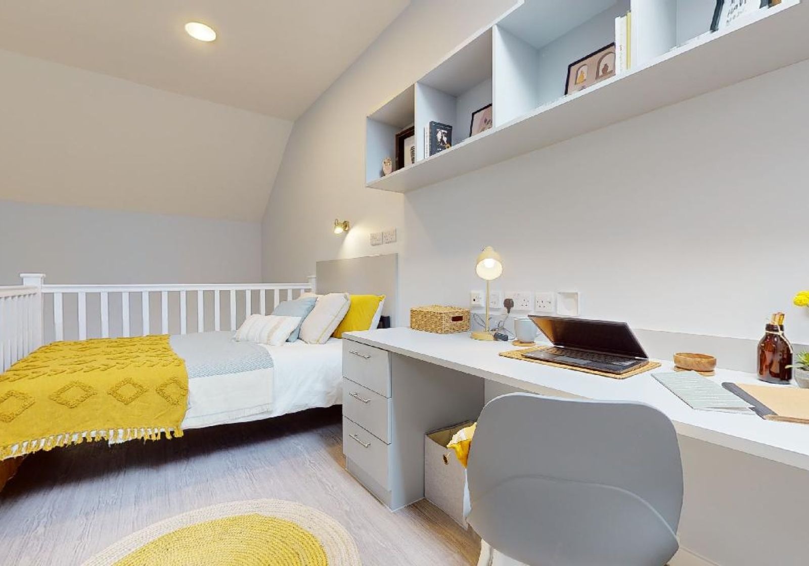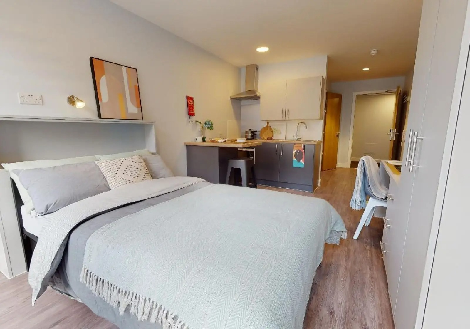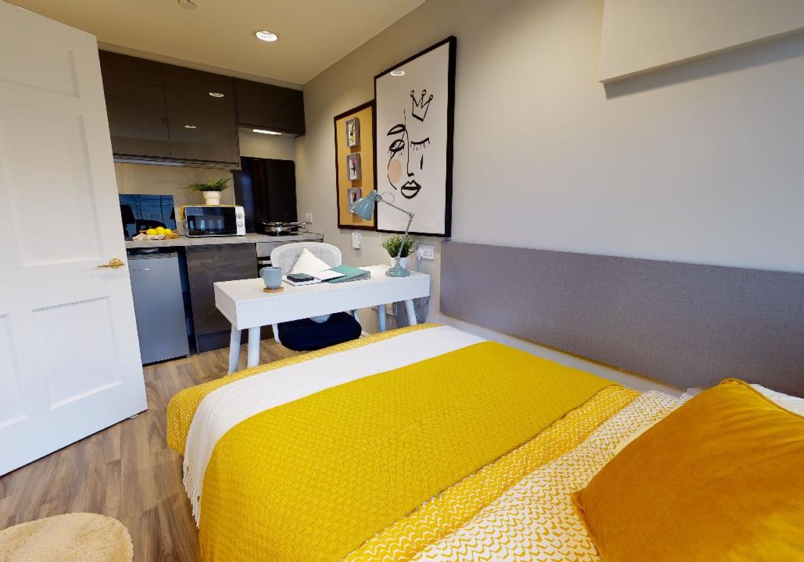 This stylish apartment offers an independent lifestyle and has plenty of features. There’s a double bed, study space and a private shower room, as well as your own kitchen and dining area, plus you can enjoy our social spaces including a gym, cinema room, library and lounge.