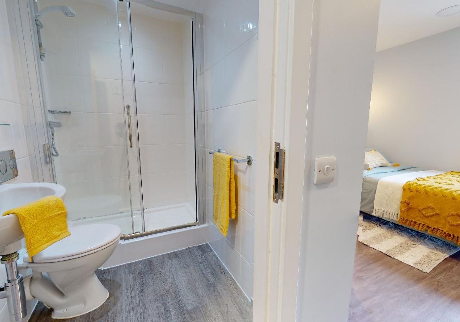ELLI400-280425Offering extra space at 20-22 sq m and with a small double bed, these rooms give you more at great value. With a small double bed, wardrobe, study area and en suite shower room plus your own fully fitted open-plan style kitchen with toaster, kettle and breakfast bar, Gold Studio rooms are well kitted out. They offer everything you need for a great student lifestyle, with some giving beautiful views over the pretty surroundings.