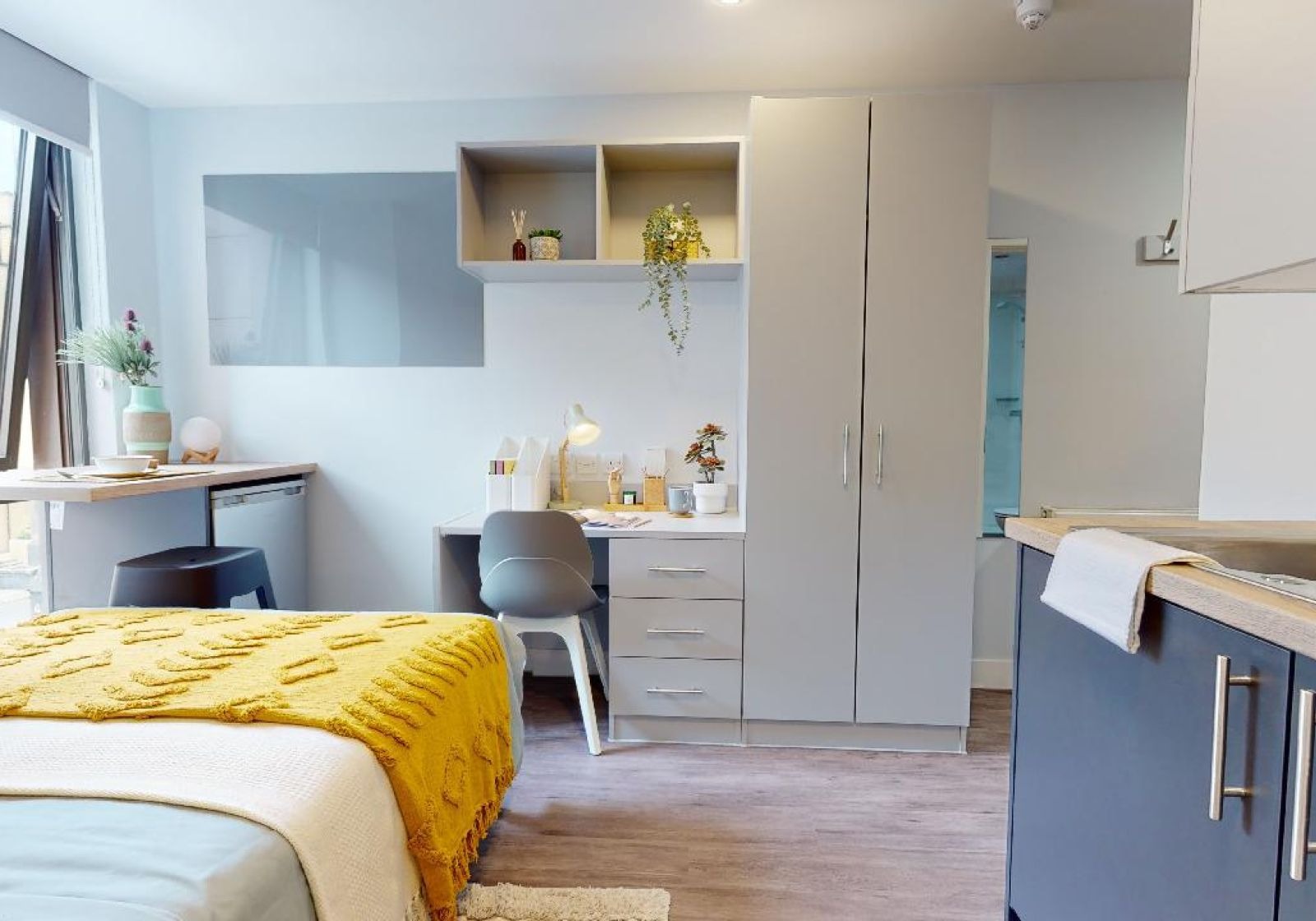 ELLI300-031125Finished in a contemporary style, our entry-level studio rooms are great value for money and have everything you need. Our Bronze Studio gives you 15-17 sq m of living space, with a small double bed, wardrobe, study area and en suite shower room plus your own fully fitted kitchen. Everything you need for a great student lifestyle, with beautiful views surrounding.