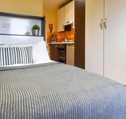 TPAD300-031125You’ll really feel the difference in our Gold Studios, with more space, storage and a full-size double bed. With more of a separate kitchen area than our other studios, two big comfy chairs and coffee table and more room to move around, Gold Studios are a cut above. You’ll also enjoy use of the building’s cinema room, gym and laundry, giving you everything you need for a great student life.
