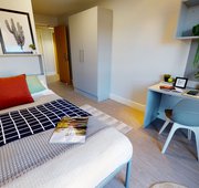 FOUN300-031125Offering great features and 12 sq m our Bronze En Suite rooms have a modern design and are great value spaces. You get your own bathroom with shower and toilet, a small double bed, study area with desk and chair and modern kitchen and living area, shared with up to 5 people. The perfect mix of privacy and sociability.