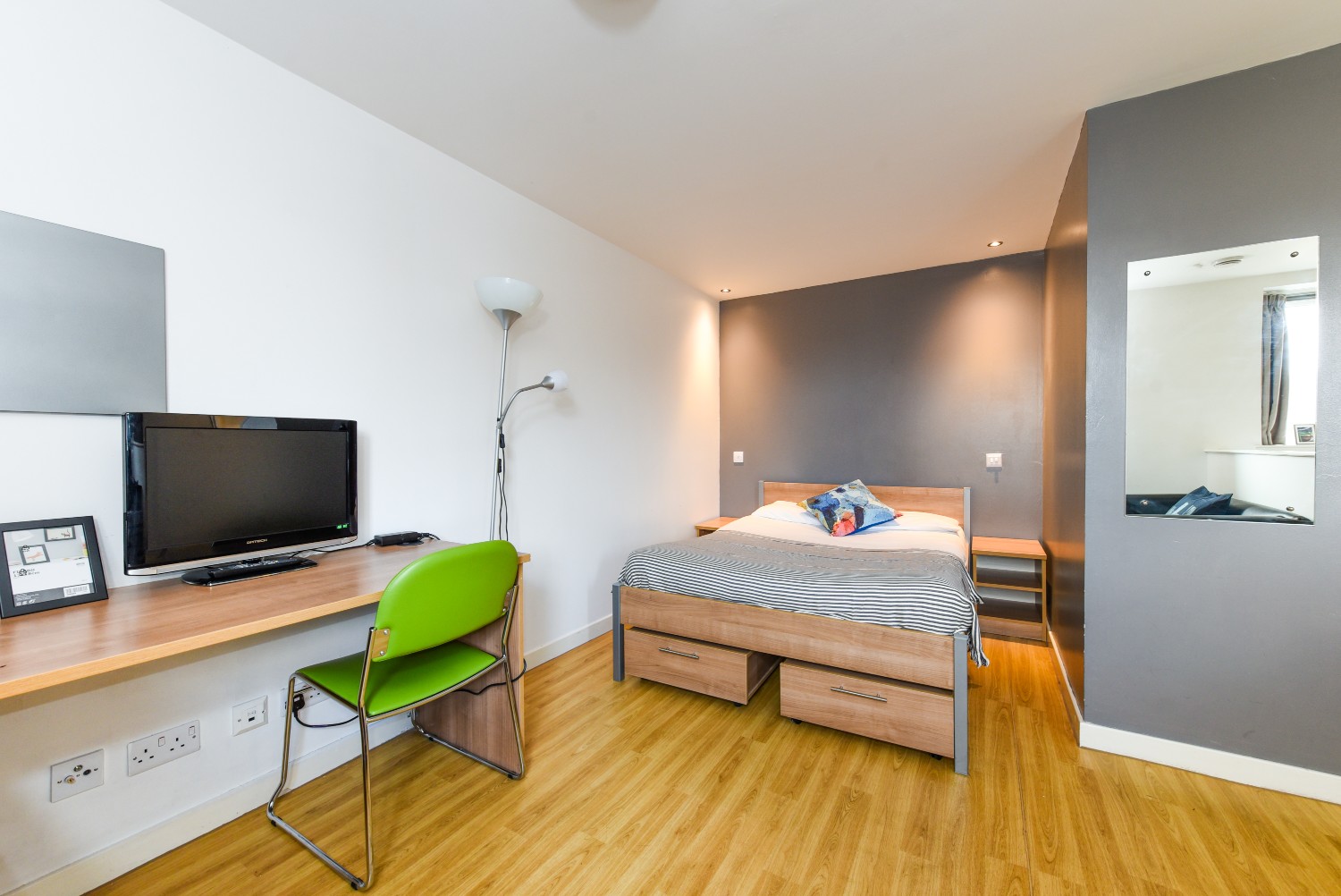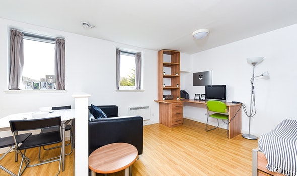 Self-contained kitchen, bathroom and living space balcony with french doors (subject to availability) 20.5 - 21.9 m2 Approximately Double bed Desk, chair, shelving and wardrobe provided in room, fully equipped kitchen with combi oven, kettle, toaster, iron and vacuum