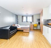 Self-contained kitchen, bathroom and living space, balcony with french doors (subject to availability) 20.5 - 27.3 m² Approximately Double bed Desk, chair, shelving and wardrobe provided in room. Fully equipped kitchen with combi oven, kettle, toaster, iron and vacuum