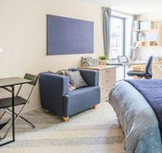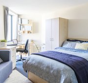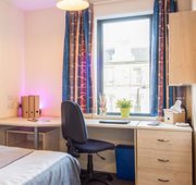 Large Bed (190x120cm) with under bed storage Wardrobe Desk Space w/ above shelving Study Chair En-suite Bathroom with shower Shared Kitchen/Living area Fan Assisted Oven 4 Ring Induction Hob Fridge/Freezer Cupboard Space Breakfast Bar w/ bar stools Sofa Seating Recycling Bin