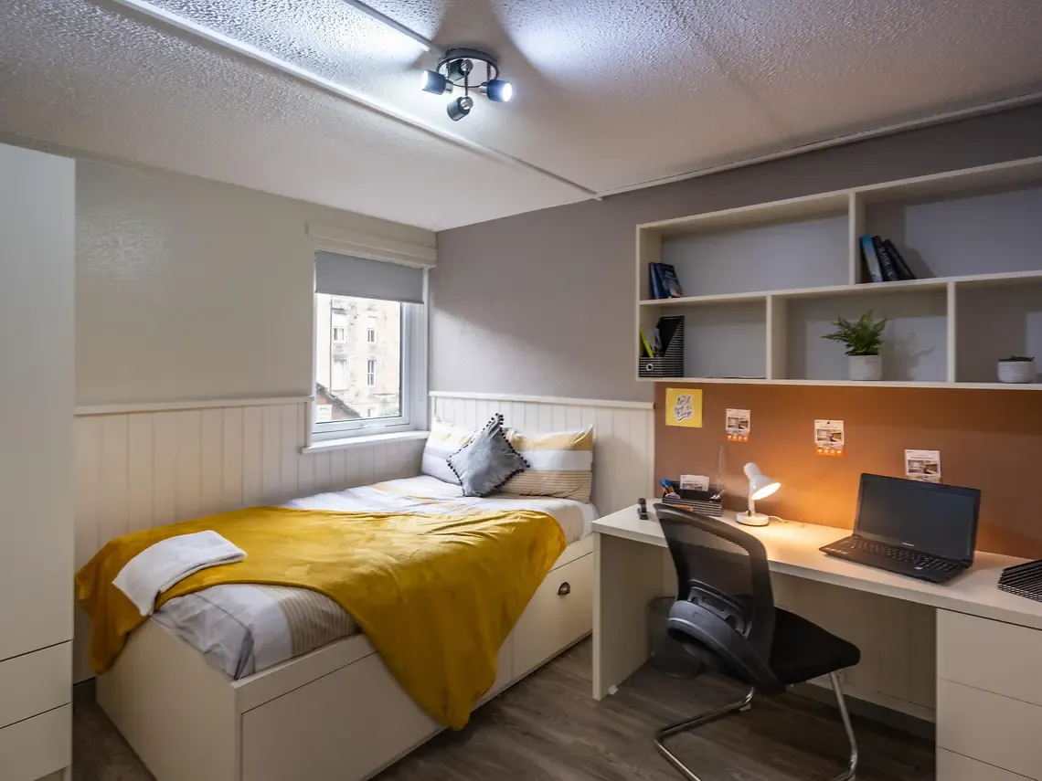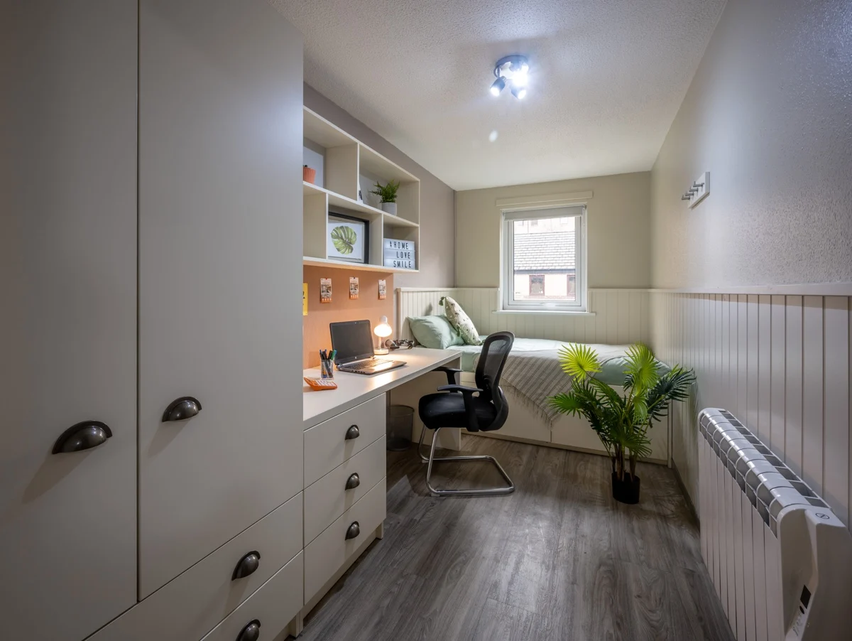 Room sizes may vary from 9m2 to 13.2m2 - double bed - Double wardrobe - Drawers - Plenty of storage - Private room access - Shared bathroom - Shared communal kitchen with induction hob and oven, and fridge freezer - Shelves - Study spaces with desk and chair - Located on the top floor of the building - Panoramic views
