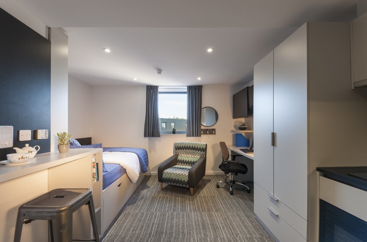 These spacious studios come equipped with stylish fitted furniture, enhanced features, a modern kitchen, large comfy bed and Smart TV.