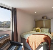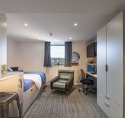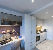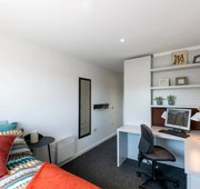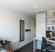 The en-suite room, with an average floor plan of 14.3m2, offers plenty of space. Simply add your own choice of bedding to the large bed, and bring towels for the en-suite shower room. The shared area includes a modern kitchen and lounge complete with all the essentials, including a TV, fridge/freezer, microwave, iron, ironing board, vacuum cleaner, just add utensils.