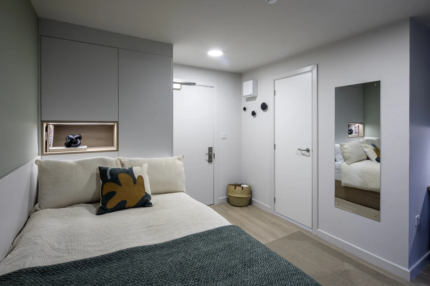 Room sizes may vary from 28m2 to 29.4m2 - Your own private studio - ¾ Bed with under bed storage - Over bed storage - Fitted wardrobe - Study desk and chairs - Over desk shelving with down light - Pin board - Wall mounted hooks - Full height mirror - Fitted kitchenette - Private en-suite with shower