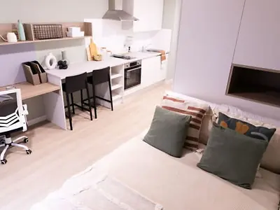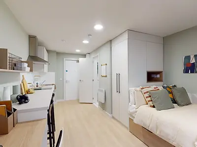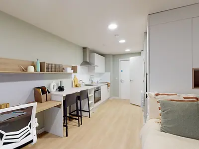 Room size of 31.5m2 - Your own private studio - ¾ Bed with under bed storage - Over bed storage - Fitted wardrobe - Study desk and chairs - Over desk shelving with down light - Pin board - Wall mounted hooks - Full height mirror - Fitted kitchenette - Private en-suite with shower