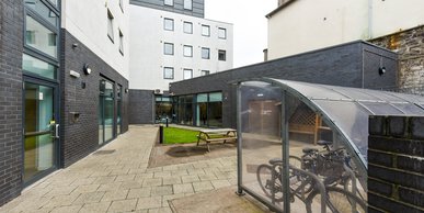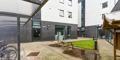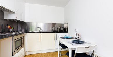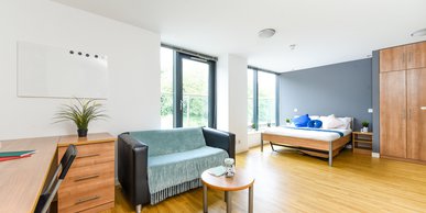 Self-contained studio bedrooms with own kitchen and bathroom Dual-occupancy available 17.3m² Approximately Double bed Personal study space with desk, chair and wardrobes for additional storage, fully equipped kitchen with combi-oven, washer/dryer machine and kettle
